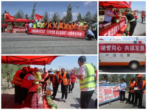 活动现场,李静站长带领支部党员志愿者服务队,将精心准备好的西瓜、矿泉水、绿茶以及熬制好的绿豆汤等防暑降温物品,一一送到307国道大中修项目工程队手中,为他们送上一份清凉,同时,叮嘱他们注意夏季防暑降温,防止高温中暑。