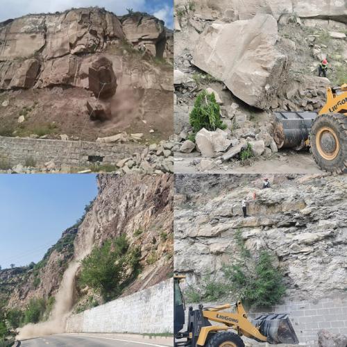 重点对公路沿线高边坡、桥梁、涵洞、路面、路基、排水设施、交安设施、临水临崖等路段进行排查,对损坏部分进行详细记录,随后及时安排小修作业进行修复。对淤堵的边沟、涵洞、急流槽、泄水孔等排水设施,及时进行清挖。对高边坡有危石,存在重大安全隐患的,该段立即组织人员机械进行清理,此次处治沿黄观光路K38+500-K38+550,K97+400-K97+500高边坡危石共计55立方米,做到及时发现、及时处理、不留隐患,确保道路安全畅通。