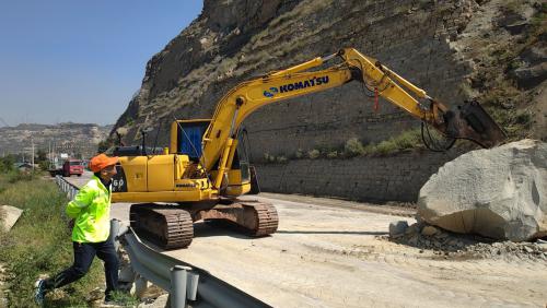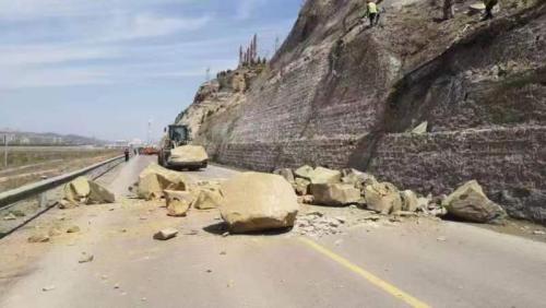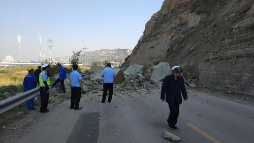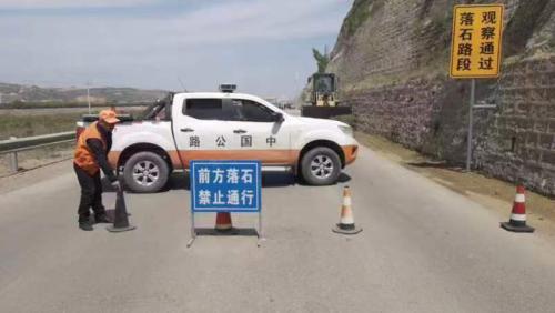 发现险情后,马勇班长一边指挥班员摆放安全警示牌、锥形桶等安全设施,一边向段领导汇报,在于当地交警取得联系,即时封闭道路。并立即投入水毁抢险。马勇班长马不停蹄地联系装载机、挖掘机及时到现场。收到险情讯息后,郝红峰副段长立即组织了路政人员、车辆赶赴现场指挥,立即开展抢险工作,全力清理大块落石。