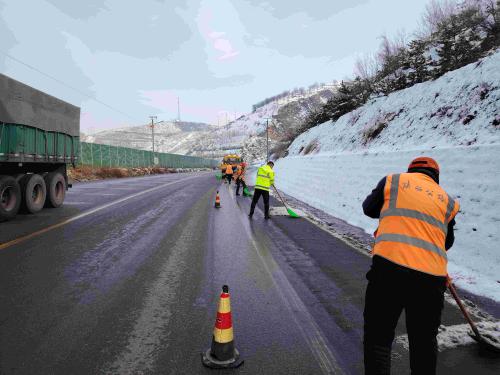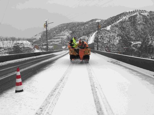 此次除雪保畅工作中,共出动除雪撒布车2台班、装载机推雪2台班、养护人员40人次,撒布融雪剂(盐)8余吨,撒布防滑料15余方。