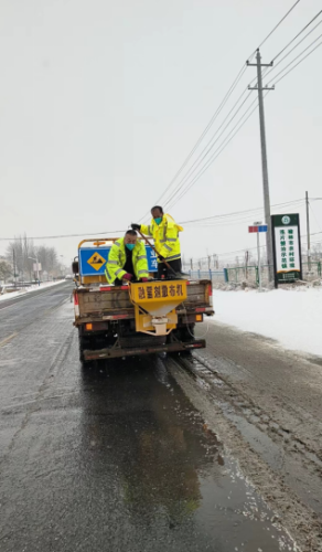在除雪保畅工作中,养护一线职工充分发挥“铺路石”精神,不惧严寒,全身心的投入工作中。对积雪路面撒融雪剂进行清理路面冰雪,全面保障养护公路安全畅通的通行环境。
