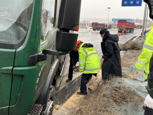 除冰过程中,有职工发现站区对面有一辆大货车因轮胎打滑,冲入道路边沟无法驶出,赶忙呼叫其他职工前去帮忙,与货车司机一同向轮胎四周抛洒干土,搬来石块垫平边沟。同时站长冯海洋安排职工负责指挥疏导,通过手势引导、喇叭喊话的方式,引导过路司机降低车速、控制车距,防止发生相同事故。经过半个多小时的努力,货车终于成功脱困,驶出边沟。“真的太感谢你们了,如果没有你们,我们今天都不知道什么时候才能脱困”货车司机激动地说。职工们表示为人民服务是我们作为一名公职人员的职责,并叮嘱货车司机以后在雨雪天气行车时一定要谨慎慢行,提前做好相关防滑措施,确保行车安全,在目送货车安全驶离后,又将精力投入到了紧张的除冰工作中。