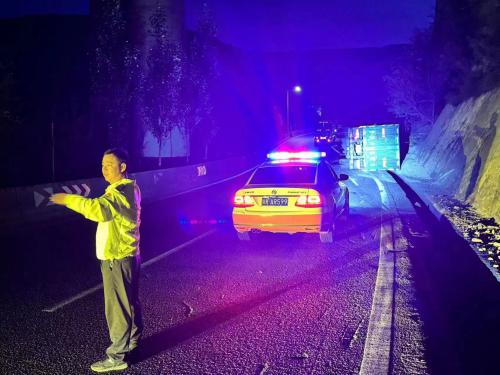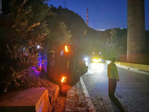 7月28日21时30分许,该站执法人员在G338府店线路面巡查途中,发现K893+350m处发生一起重型载货半挂车侧翻交通事故。事故现场,货物洒落一地,车辆整体受损严重,现场未设置任何警示标志,存在极大安全隐患。面对突发事故,执法人员快速反应、主动作为,迅速协助司乘人员离开驾驶舱到安全地带,及时拨打122报警电话和120急救电话。随后在事发地前后方摆放三脚架、反光锥桶,有序指挥道路交通,有效防止二次事故发生。经过多部门配合协助,事故车辆被及时拖离现场,受伤人员得到有效救治,路段恢复正常通行。