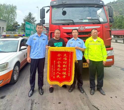 7月30日10时,山西大同一货车司机将一面“危难时刻伸援手、全心全意为人民”的锦旗送到孤山治超站执法站点,感谢治超执法人员的热心救助。