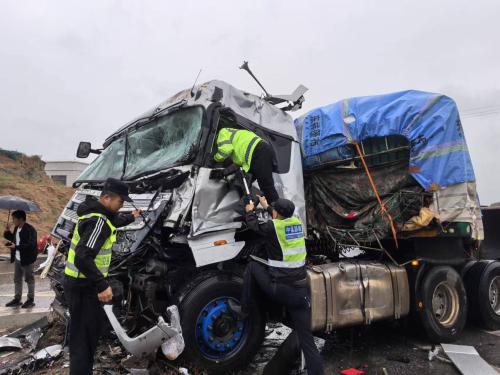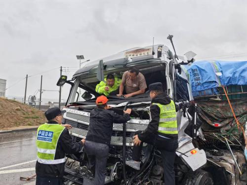 2024年9月29日上午7时许,秋雨潇潇。在横山超限检测站检测室上班职工发现超限站办公楼门口G210K663+600M处,两辆6轴货车发生交通事故,车辆均发生倾翻,车头因肇事挤压,两名司机均发生不同程度伤害,其中一名司机被困驾驶室。