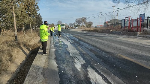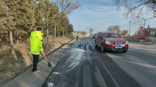 进入冬季,大货车行驶在山区长大纵坡路段和弯道处频繁使用汽车淋水器,导致路面出现结冰现象,给过往司乘人员和群众出行造成潜在安全隐患。为了及时消除道路安全隐患,靖边公路段组织专业养护人员采用抛撒防滑料和融雪剂、融雪盐的办法消除暗冰。截至目前已对35处长大纵坡路段、20余处弯道进行了破冰作业,同时及时、足量的补充短缺的防滑材料,以满足司乘人员需要。