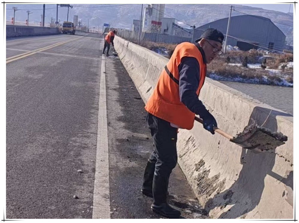 寒风中,橙红色的养护服成为公路上一道亮眼的风景线。工人们的脸颊被冻得通红,双手僵硬,却依旧认真细致地完成每一项清扫任务。他们用坚守与汗水,换来了辖区公路的干净整洁与安全畅通,彰显了公路养护人的责任与担当。