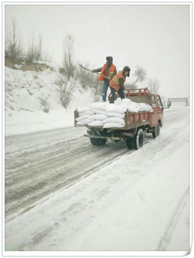 我们撒防滑料 清理积雪