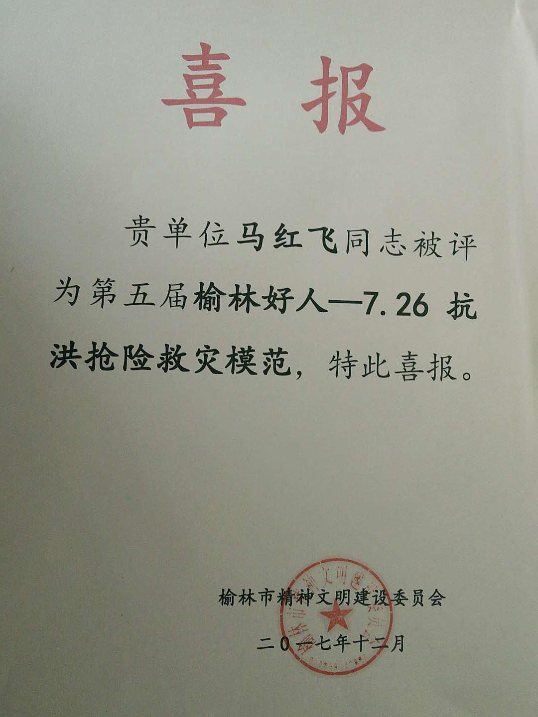 近日辛店治超站站长马红飞被榆林市精神文明建设委员会评为第五届榆林好人-7.26抗洪抢险救灾模范。