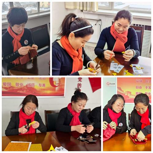 活动现场一片欢声笑语,金色的福字,银色的丝线,缤纷的饰品,经“巧媳妇”们的穿针引线,设计图案、镶嵌饰品,不一会,一个个精美的福袋呈现出来。