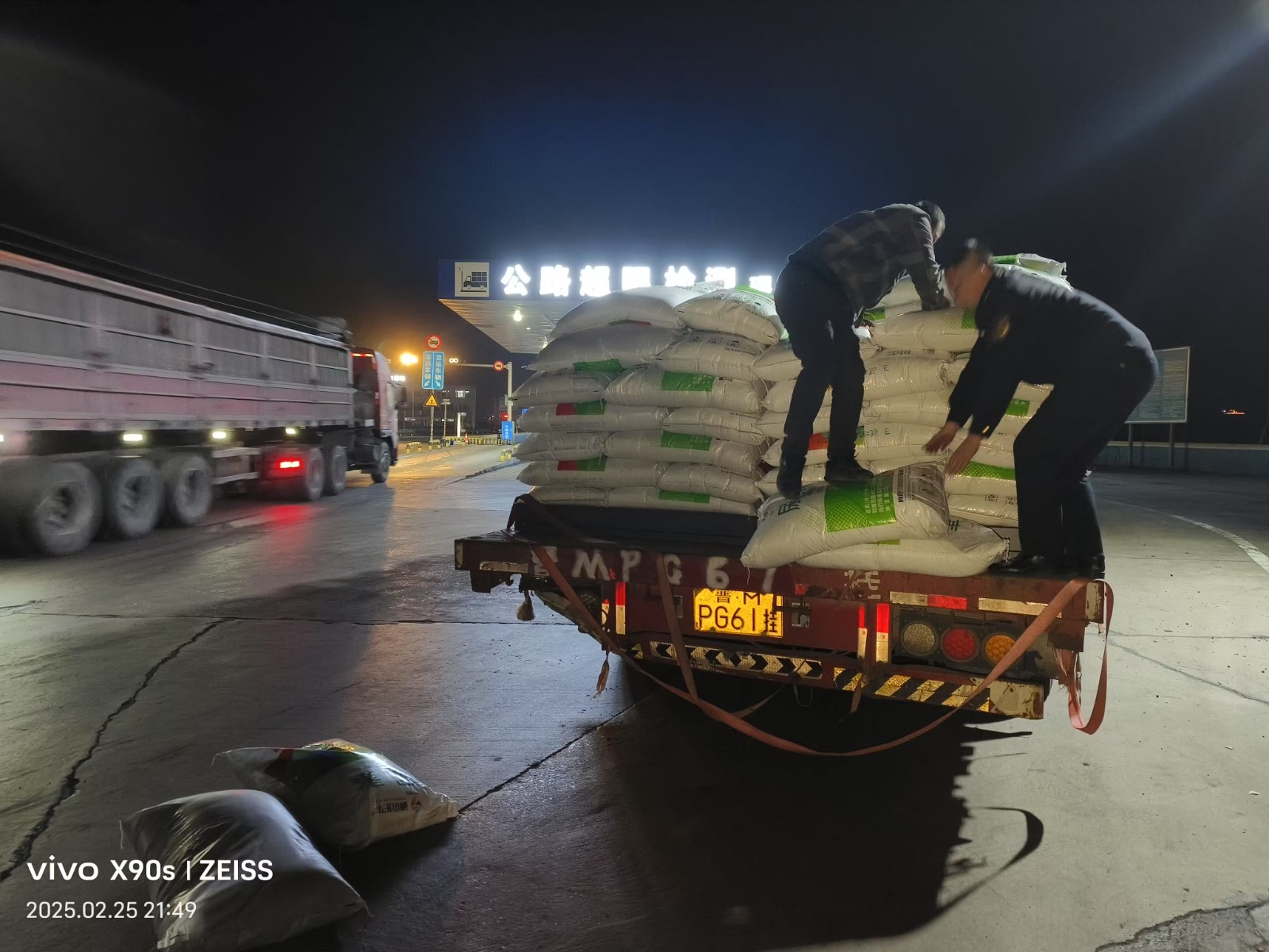 2025年2月25日21时30分左右。一辆半挂车装载化肥从神木运往中鸡镇,途经碾房峁超限站时不慎散落部分货物,司机一人望着满地货物不知所措,正当司机焦急无助之际,碾房峁超限站的职工们及时发现特殊情况,迅速伸出援手。工作人员分工协作,一人在该车后方放置反光锥形桶,同时指挥着过站车辆,确保交通安全;另一人同司机合力将散落在地的化肥重新装载至货车上,并将货物捆绑牢固,以确保后续行车的安全。该站职工的热心举动让司机连连道谢,他说:“实在是太感谢你们的帮助了,我要给你们站上的工作人员点一个大大的赞!”