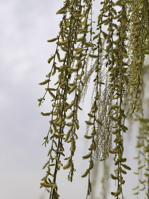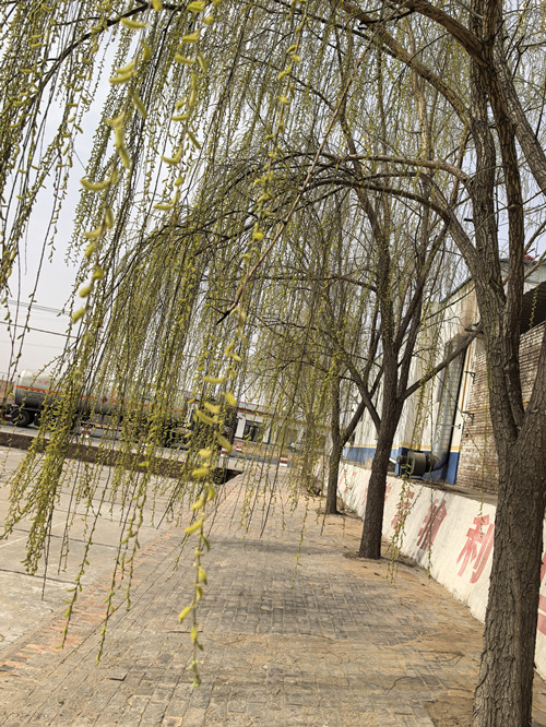 起初,嫩绿的芽儿如羞涩的孩童,小心翼翼地探出脑袋,怯生生地张望着这个崭新的世界。南首那棵每年总是率先出绿,新入职的来兵说是因为阳光偏爱,我望着远处起伏的黄土边墙笑道:“哈哈,太阳的格局没那么小吧”。柳芽在阳光的呵护下迅速蜕变,长成细长的柳尖,还是浅浅的绿,有点翠。微风中轻轻摇曳,似是大自然垂下的绿色珠帘。恍惚间,竟与千年前贺知章笔下的“碧玉妆成一树高,万条垂下绿丝绦”遥遥相应。