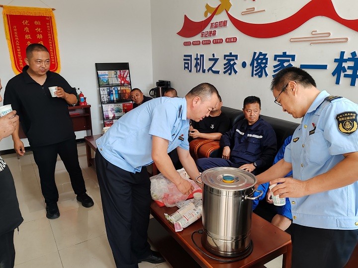 为了驱散夏日的炎热和等待的烦闷,工作人员精心准备了一碗碗热气腾腾的绿豆汤。绿豆汤散发着淡淡的清香,每一口都带着丝丝凉意,沁人心脾。同时,一句句对司乘人员的亲切问候,如同一股暖流,流淌在司机们的心间。